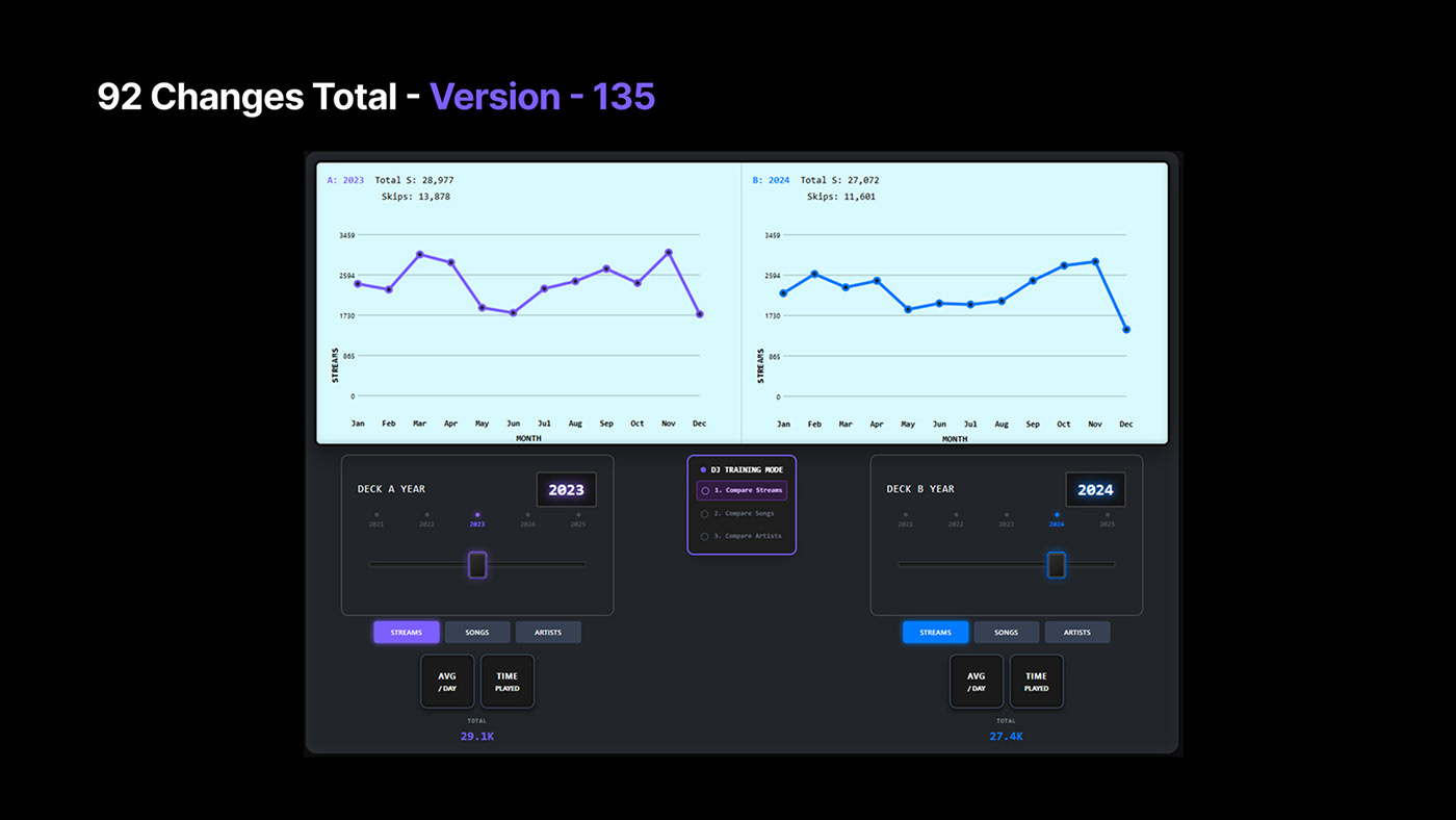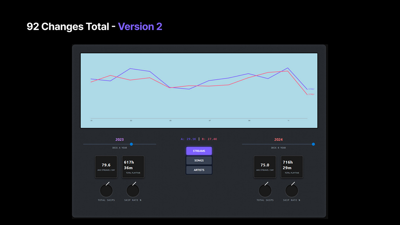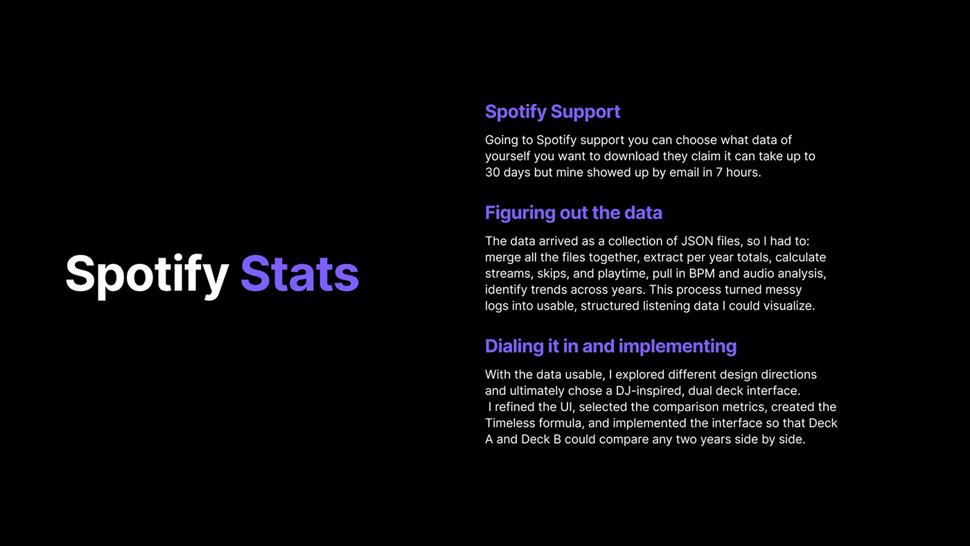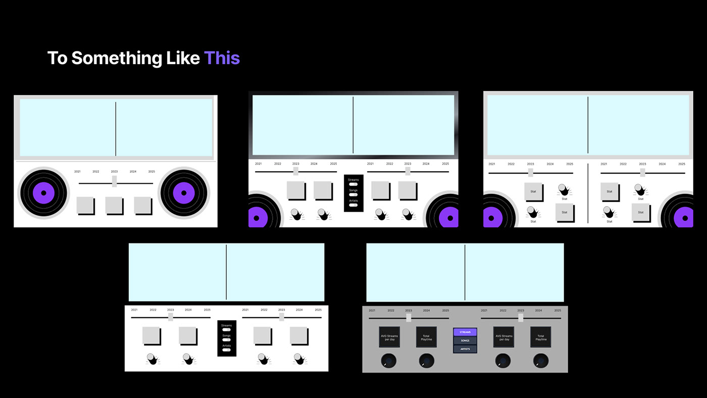 A data-driven interface that transforms five years of Spotify listening history into an interactive DJ-inspired console. The project uses Figma makes new AI tool for supported data structuring, visual hierarchy, and exploratory interaction design.