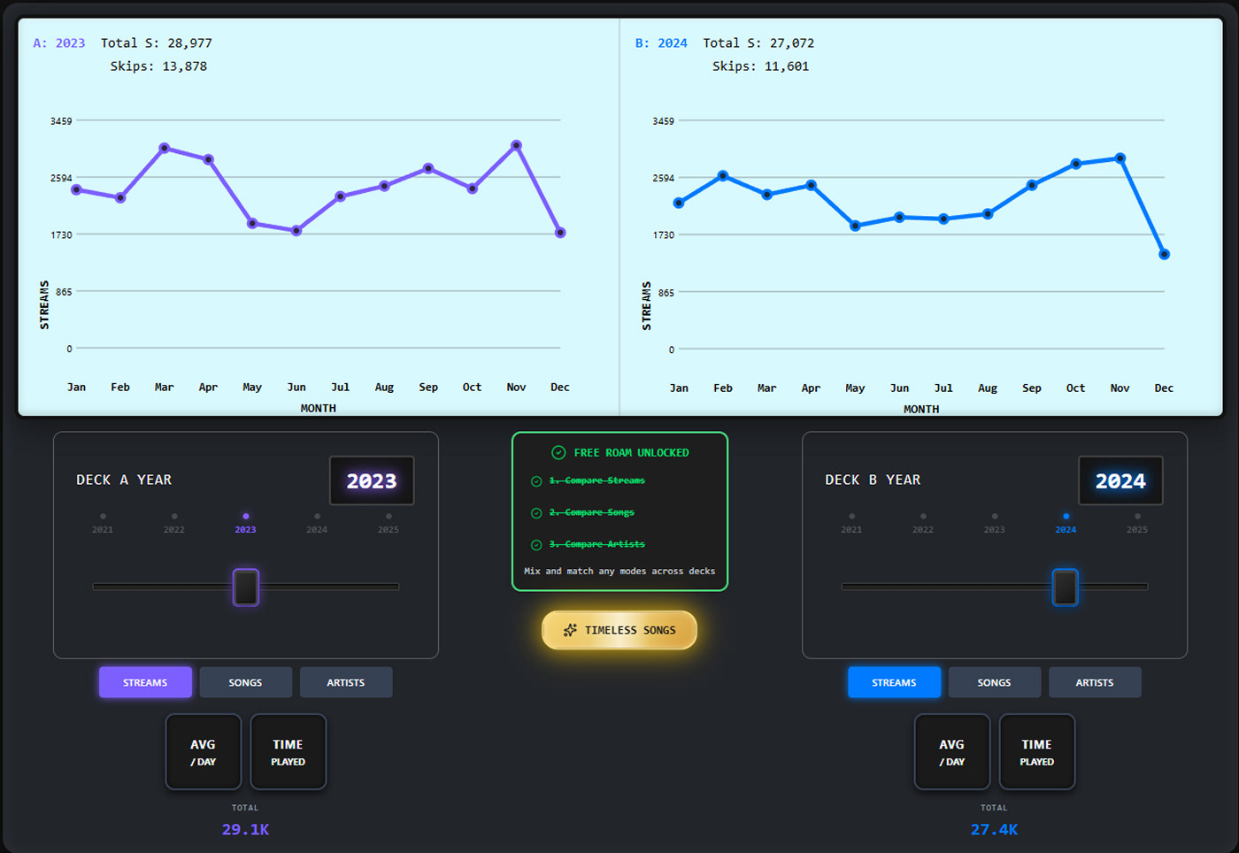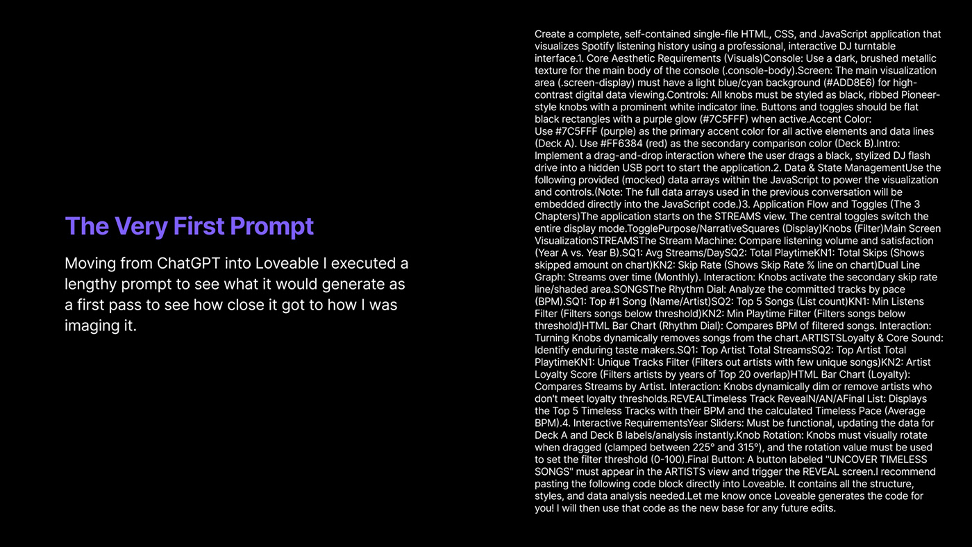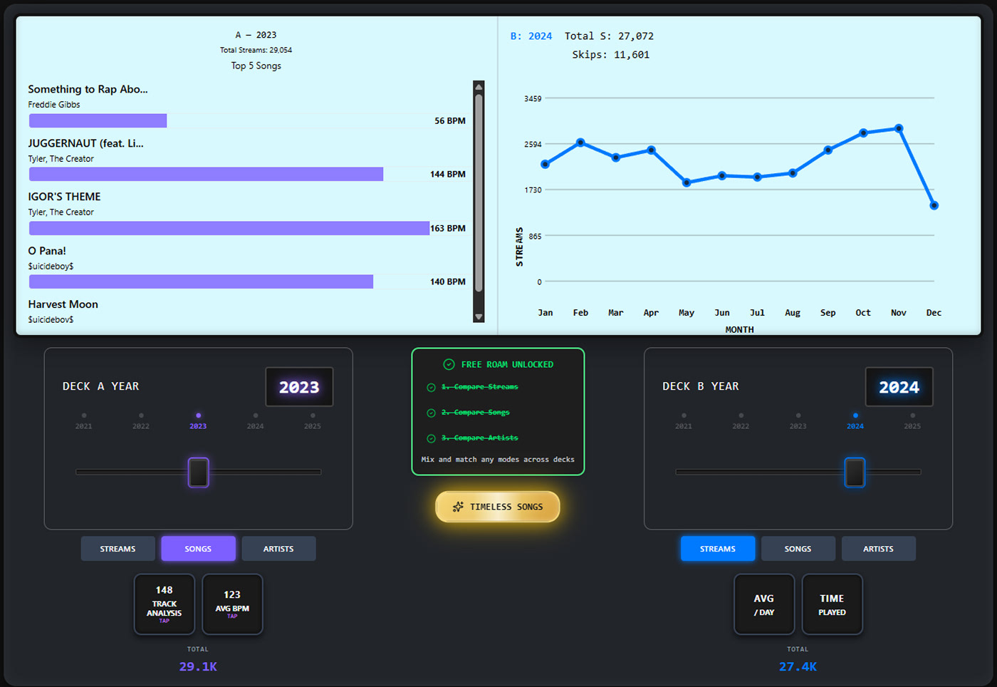 A data-driven interface that transforms five years of Spotify listening history into an interactive DJ-inspired console. The project uses Figma makes new AI tool for supported data structuring, visual hierarchy, and exploratory interaction design.
