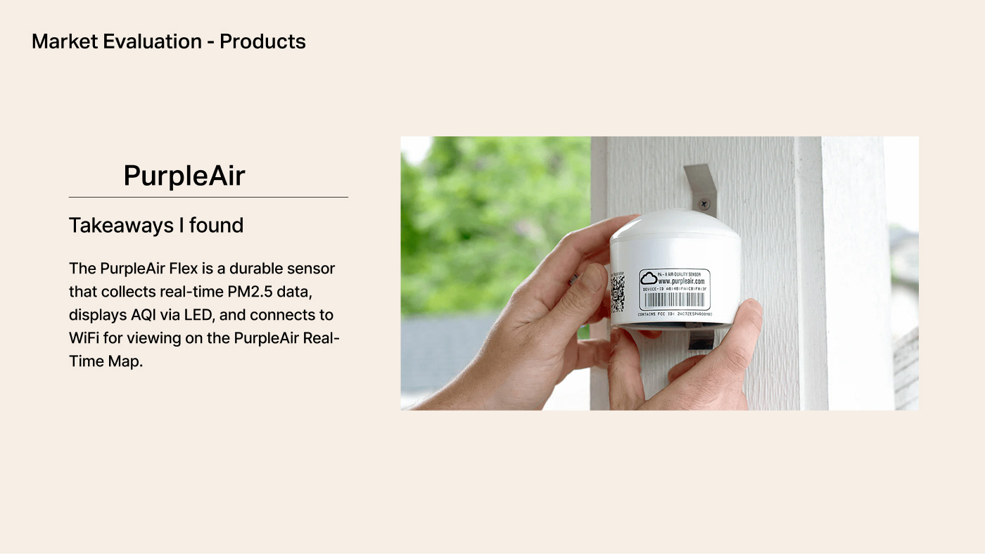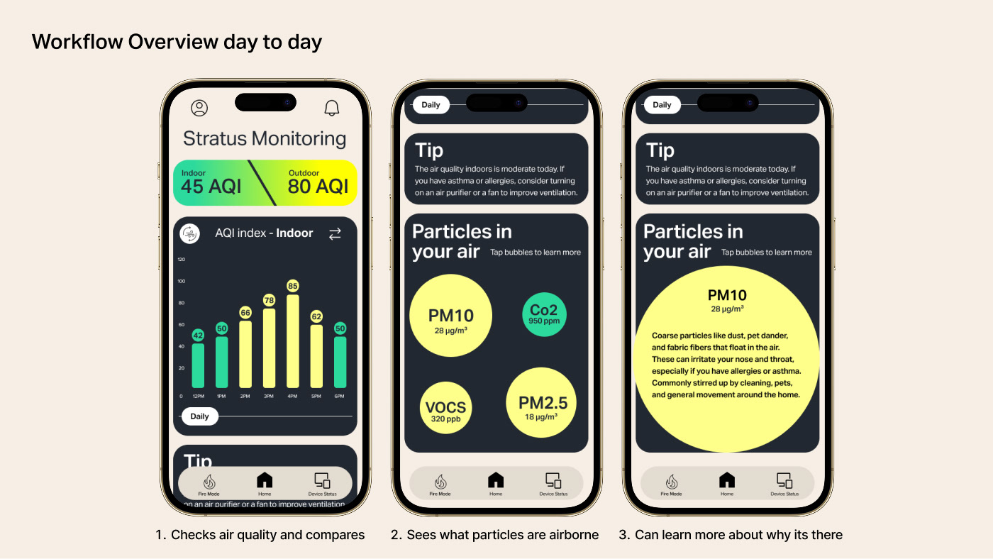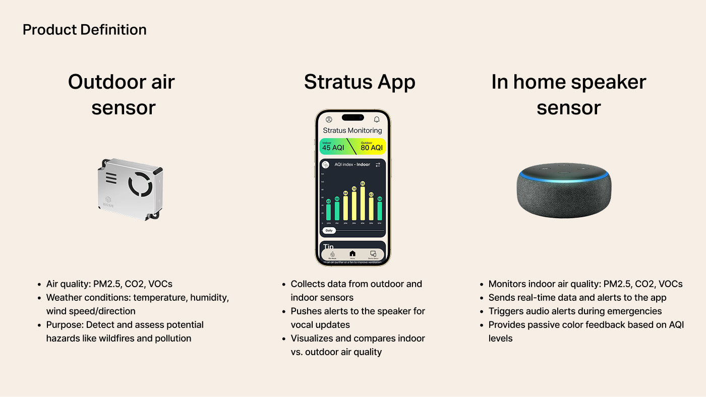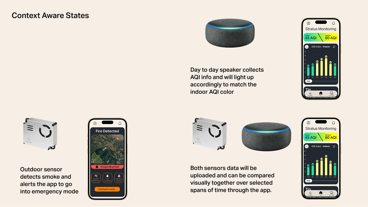 A multi surface product concept designed to help households monitor and respond to wildfire related air quality risks. The system connects an outdoor air quality sensor with an indoor air monitor and a mobile application to translate complex environmental data into clear, actionable guidance during high risk conditions.