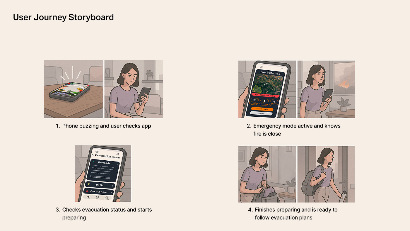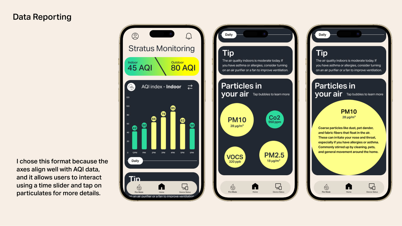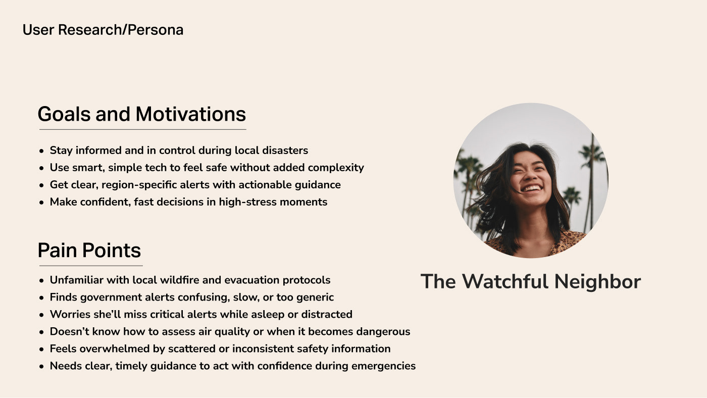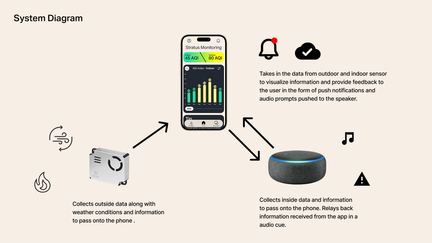 A multi surface product concept designed to help households monitor and respond to wildfire related air quality risks. The system connects an outdoor air quality sensor with an indoor air monitor and a mobile application to translate complex environmental data into clear, actionable guidance during high risk conditions.